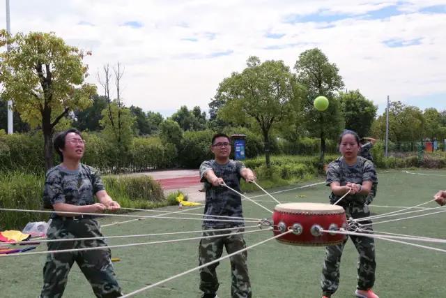 今天的拓展活動有四項內(nèi)容,所有的學(xué)員分成三個組,大家選出了自己心目中隊長和副隊長,一隊精英隊,二隊輝煌隊,三隊是戰(zhàn)狼隊,一個個響亮的隊名,一個個錚錚的口號,大家士氣倍增,干勁倍足。在150秒內(nèi)完成四個挑戰(zhàn)項目,這是很好的檢驗團隊力量的項目。擊鼓顛球,多人拽繩拉鼓,小球在鼓上顛球不少于8個,活動才算通過,否則球落地重新開始。這檢驗的是團隊的平衡力和配合協(xié)作力。第二個項目就是隊員手拉手,套繩從每個人身上傳過,手不允許松開,考驗的是隊友之間的配合默契度。第三個項目是巧運乒乓球,每個隊員手里拿著一個塑料小槽,球在小槽里流動,大家一個一個的接籠,不允許落地,否則重新開始。Zui后一個項目是大家站成圓形,分別向左右隊員背部擊掌,說出一個字擊一掌,說出兩個字擊兩掌,大家必須整齊劃一,Zui后左右擊八次掌喊出“我們是Zui棒的團隊”這個口號,如果團隊配合不協(xié)調(diào),聽出一個雜音都要重新開始,這是團隊士氣的Zui佳考驗。